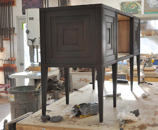 We delivered a nice Art Deco influenced sideboard/bar last week ... It was a fun and challenging project. Someone referred to it as Dean Martins Bar ... I lived in Palm Springs in 1970 for a winter, and it would have been right at home in the house we rented for sure ... The design was a quick sketch I doodled off after a series of rejected CAD drawings ... Sometimes the quickest drawings are the best ... Anychoice, there was more to building this then first meets the eye when you look at the sketch. Click the pictures to enlarge them ... Trevor fluted the legs on the cnc ... we stopped the detail at the tops and bottoms of the door/panels Will then mortised the legs and created the back and side panels We couldnt come up with any choice to easily do the concentric squares, so we filled the micro pin holes with hide glue and walnut sawdust and sanded them off the next day ... worked sweet and even took the stain and paint ... Panels finished and case parts ready to assemble Assembly without the panels After we applied the moldings to the 1/2" mdf doors, we had to rabbet the door edges and install solid wood edges ... hence the masking tape in this photo Corner and door close up.....stainless steel knife hinges from Brusso Hardware Trevor put the lights in even though they were cut from the budget ... We had them on hand from another project and it didnt seem right without them ... Then we mocked up up the metal end pieces and mirror frame size and got those dimensions all finalized The finishing process for this piece involved applying a coat of fairly strong brown/red aniline dye, sanding that pretty aggressively and then applying a second coat of the stain along with some black latex paint at the same time ... That mix was sponged around until it looked right and then polished about a half hour later with steel wool and paper towels ... This paint/stain mix makes a nice durable finish as is, but we alchoices add a couple top coats of oil varnish mix for a little shine ... I finished my kitchen with this finish 10 years ago and with a little damp spongeing it comes back to looking pretty much like new ... I have reoiled once or twice in the last 10 years ... Before the oil coats after With the steel galleries by Sam in plce. They had threaded rods welded to their bottoms and were bolted on from under the frames ... We REALLY liked this piece and felt it was one of the most differect and strongest designs for the year ... Happy New Year !